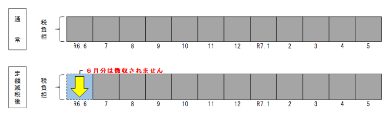 令和6年6月分は徴収されず、定額減税「後」の税額が令和6年7月分~令和7年5月分の11か月で分けて徴収します。