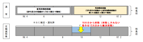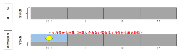 - 令和6年6月1日以降に支払われる給与等(賞与を含む。)に対する源泉徴収税額から控除され、控除しきれない場合は、令和6年中に支払われる給与等に対する源泉徴収税額から順次控除されます。