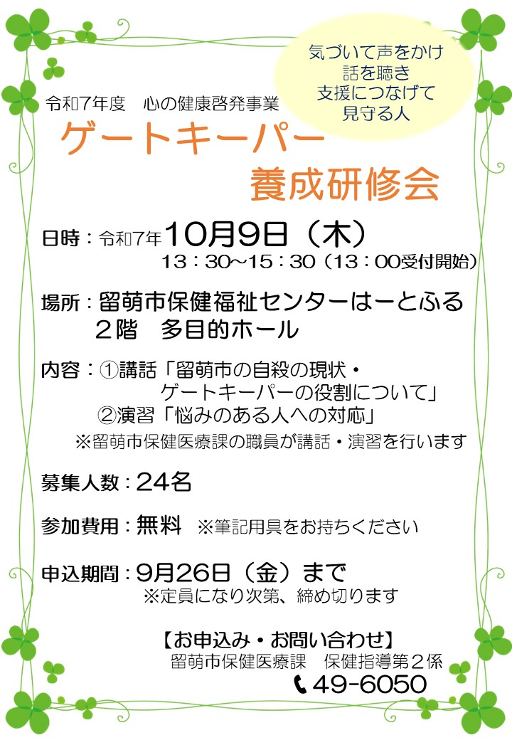 その取り組みのひとつとして、ゲートキーパー養成研修会を開催します。
