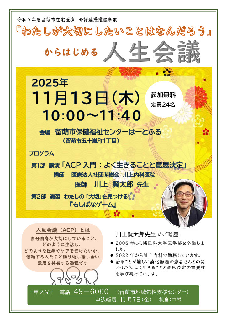 医療法人社団萌樹会 川上内科医院 医師 川上 賢太郎 先生をお招きし、ACP(人生会議)について学習します。
