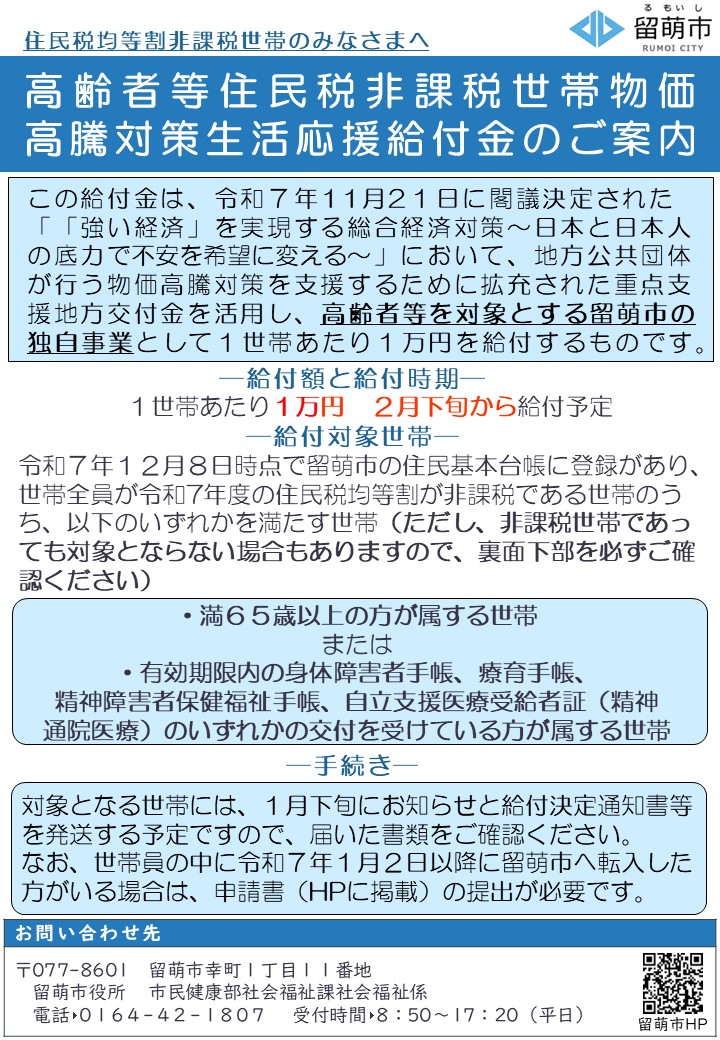 これを受けて留萌市では、生活者への支援として示されている物価高騰に伴う低所得者世帯支援・高齢者世帯支援策として標記給付を行うこととしました。